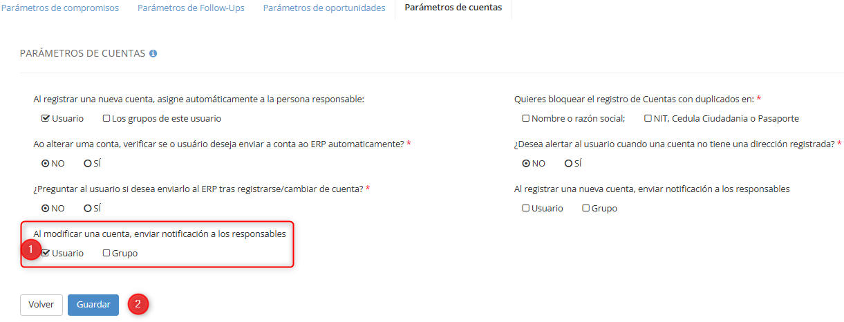 5. Seleccione 'Usuário', la opción Al modificar una cuenta, enviar notificación a los responsables, como se muestra en la siguiente imagen: