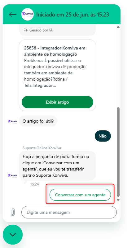 8. Si el artículo no fue útil, haga clic en No y continúe con su búsqueda, o haga clic en Conversar con un agente para que su solicitud sea enviada al Soporte Konviva:
