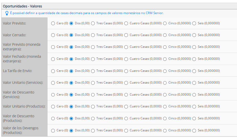 4. Seleccione el número de decimales para los campos de valor monetario de la oportunidad, según sea necesario: