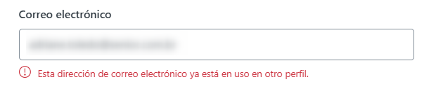 - La dirección de correo electrónico debe ser válida y no puede estar siendo utilizada por ningún otro usuario en la Plataforma de Atención Zendesk. En caso de que esto ocurra, se mostrará la siguiente notificación: