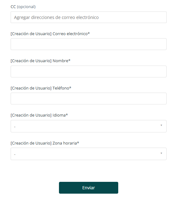 - CC (opcional): Informa, si lo deseas, una dirección de correo electrónico previamente registrada como Solicitante, que recibirá en copia el retorno de la creación de este usuario;