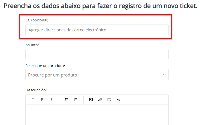 2. Al realizar a la apertura de un nuevo ticket informe la dirección de correo electrónico en el campo CC (Agregar direcciones de correo electrónico):