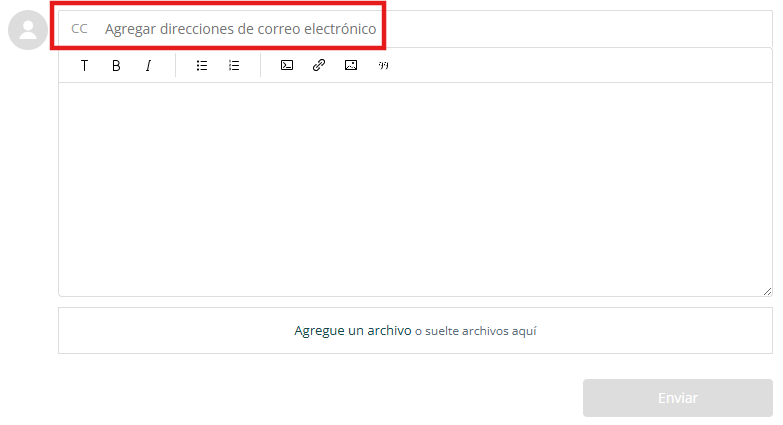 1. Al insertar un nuevo comentario en el ticket a través de la Plataforma de Atención Zendesk, complete el campo CC / Agregar direcciones de correo electrónico: