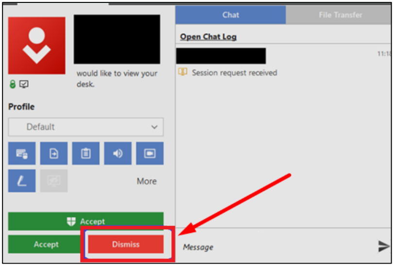 8. Para finalizar la sesión remota, puede rechazarla por medio de la siguiente opción: