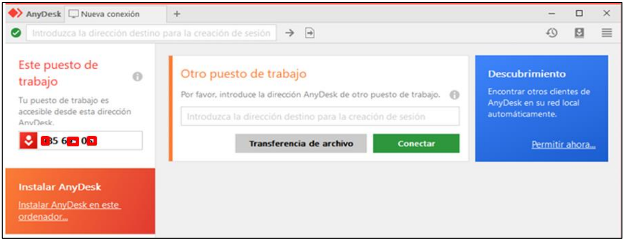 5. Posteriormente, al abrir el ícono de Anydesk, aparecerá la siguiente ventana que muestra un número de puesto de trabajo, este corresponde al número de conexión que debe informar al consultor para lograr la conexión remota: