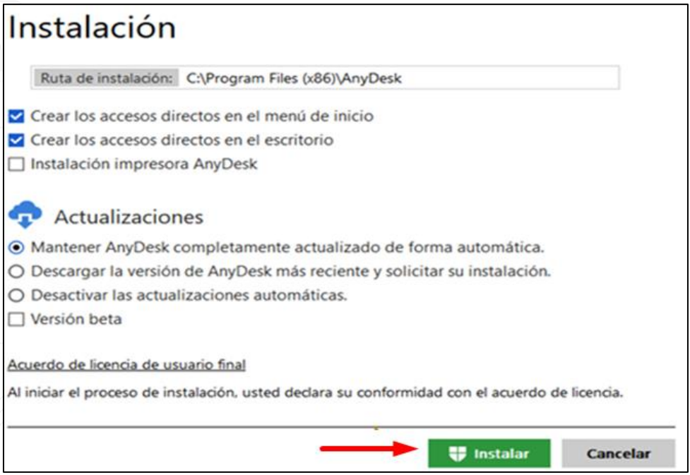 4. Haga clic en la opción Instalar AnyDesk, luego en Aceptar e Instalar y continúe con la instalación: