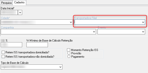 2. Caso mesmo com a alíquota parametrizada no cadastro do imposto, o cálculo não seja feito. Acesse o cadastro do imposto novamente e verifique o campo Transportadora Filial: