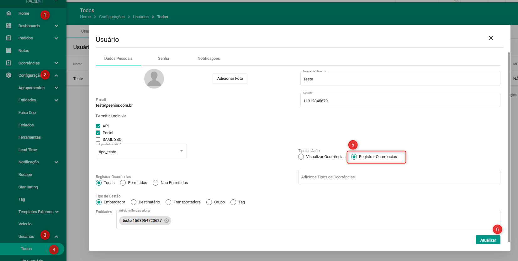 1. Acesse: Home / Configuração / Usuário / Selecione o Usuário / Flegue a opção Registrar Ocorrências: