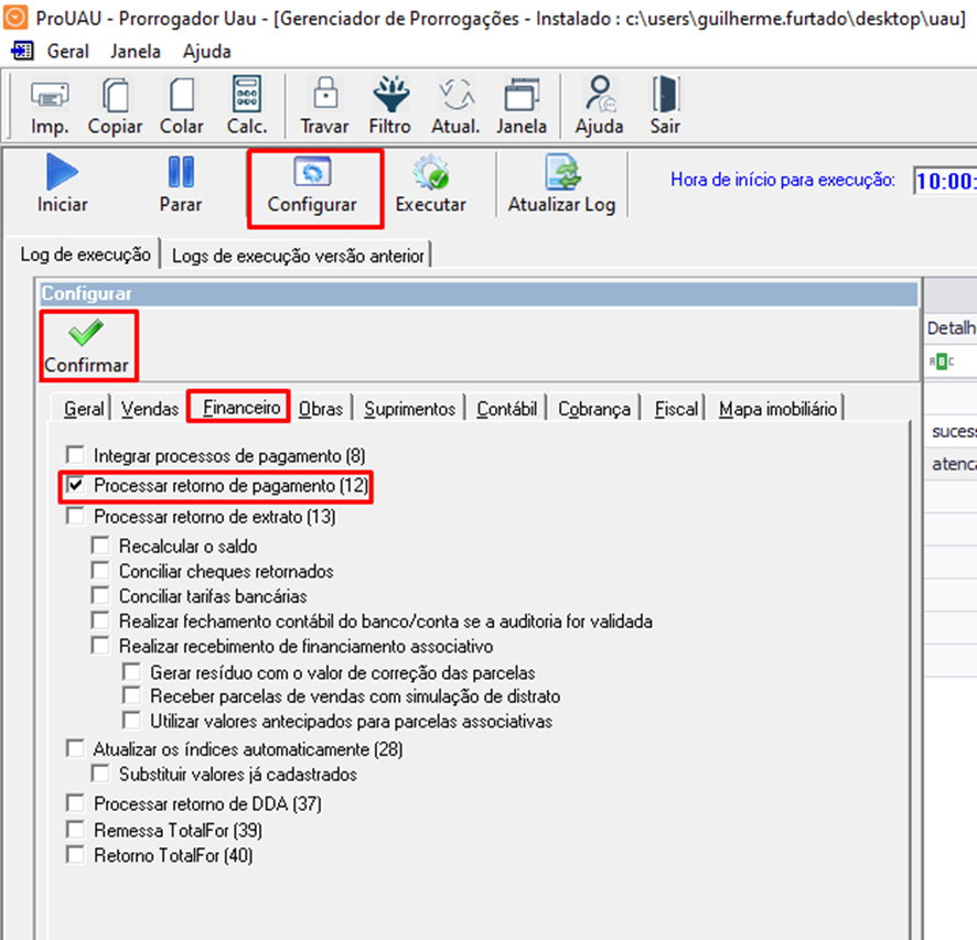 2. Clique em Configurar / Clique em Financeiro / Marcar o flag ‘Processar retorno de pagamento (12)’ / Clique em Confirmar: