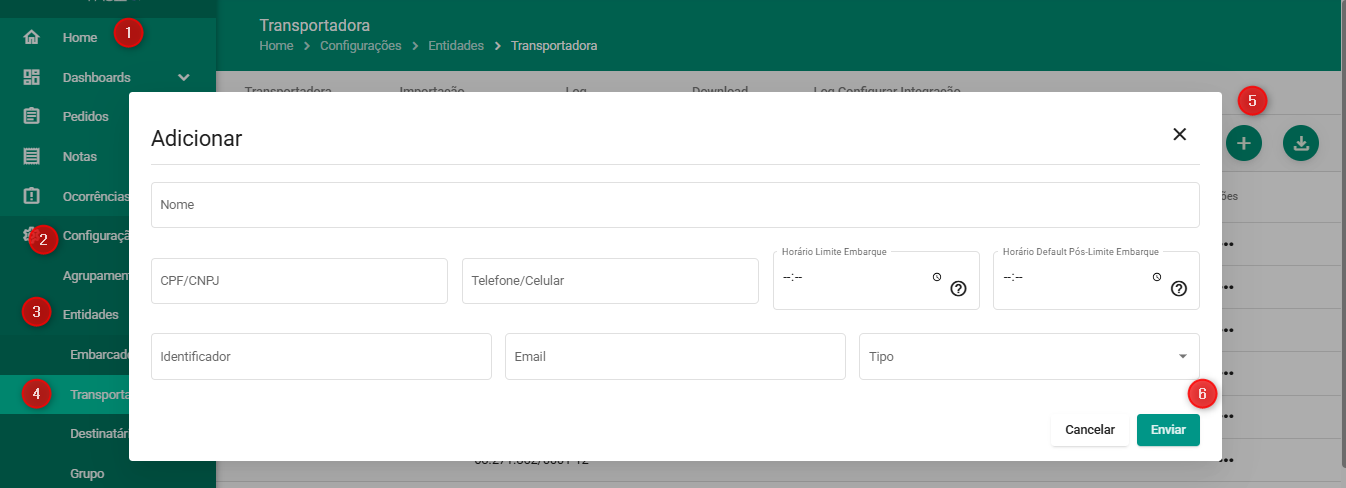1. Acesse: Home / Configuração / Entidades / Transportadora / Adicionar + / Enviar: