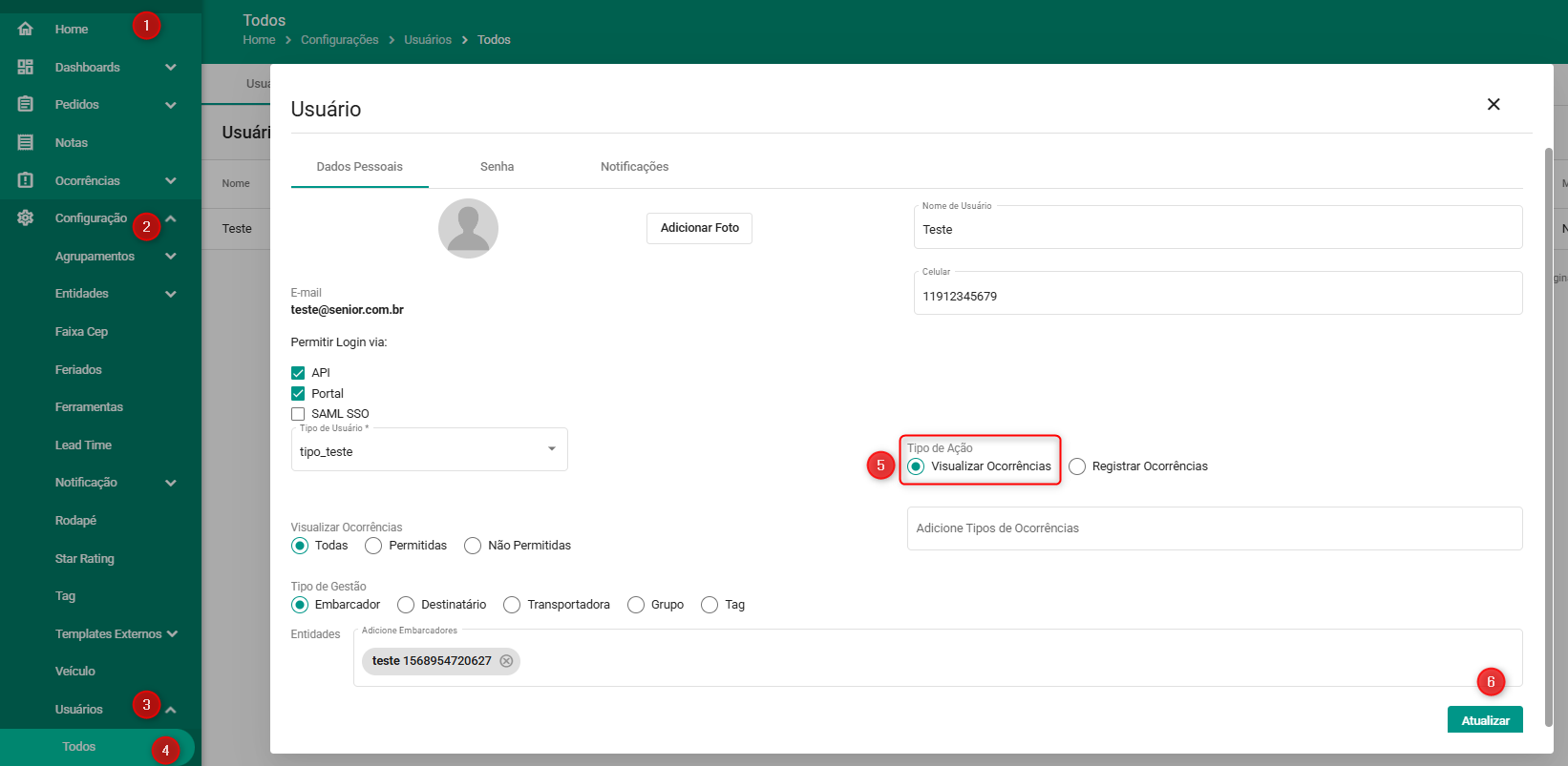 1. Acesse: Home / Configuração / Usuário / Selecione o usuário / Flegue a opção Visualizar Ocorrências: