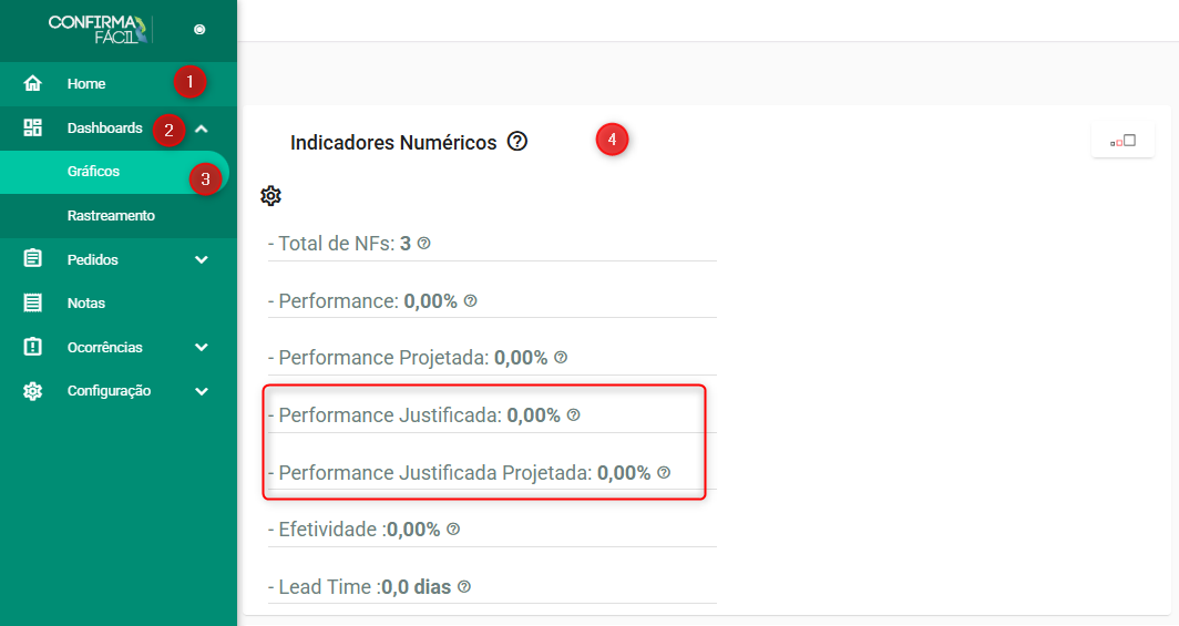 CONFIRMA FÁCIL – Dashboards – Como diferenciar a performance justificada e performance justificada projetada no gráfico indicadores numéricos