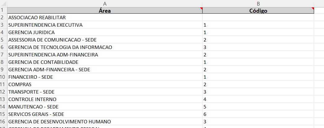 Para importar para Admissão Digital, as áreas cadastras no Administração de Pessoal, ou em folhas terceiras, será necessário possuir uma planilha contendo as informações com os cabeçalhos: Nome da empresa e Código, semelhante o exemplo abaixo: