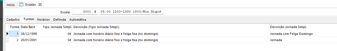 2. Na guia Escala, no caminho: Controle de Ponto e Refeitório > Pessoas > Colaboradores > Histórico > Escala, preencher o cadastro, turmas e horários, no mesmo poderá ser visto o campo revezamento.