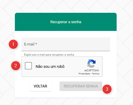 3. Coloque o e-mail, flegue não sou robô, clique RECUPERA SENHA:
