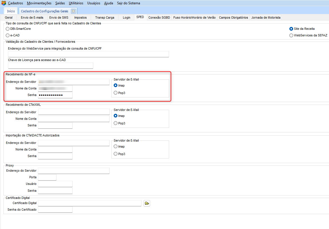 6. As operações que utilizam contas de e-mail diferentes para Envio e Recebimento, após configurar a conta de Recebimento na aba SPED, retorne à aba Envio de E-mails e configure a conta de Envio.