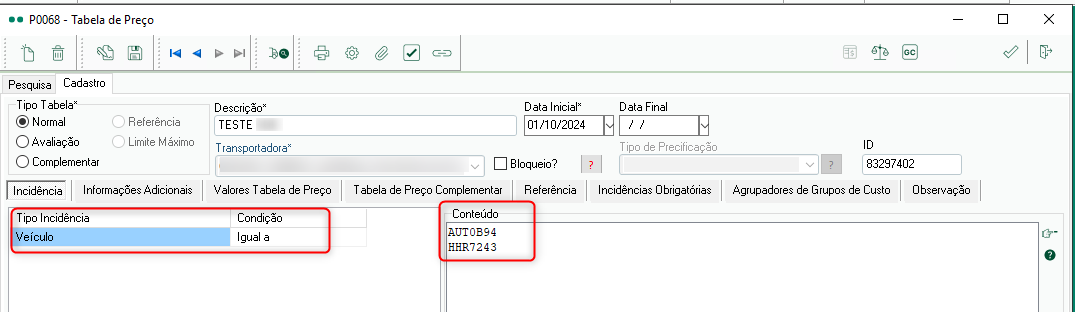 5. Na tabela de preço do transportador, o veículo cadastrado deve ser informado como incidência geral da tabela de preço. Exemplo: