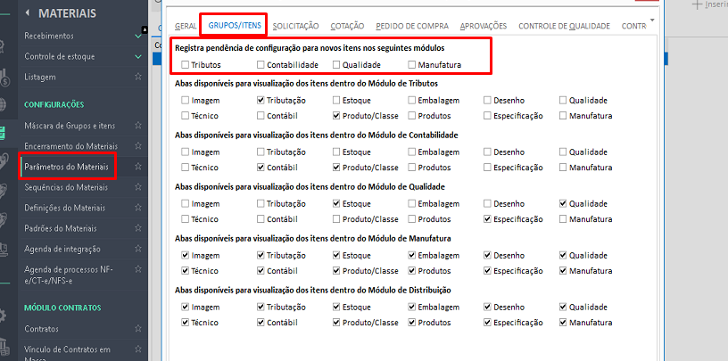 2.4. Na seção "Registre pendência de configuração para novos itens nos seguintes módulos", desmarque os parâmetros de cada módulo, conforme imagem abaixo: