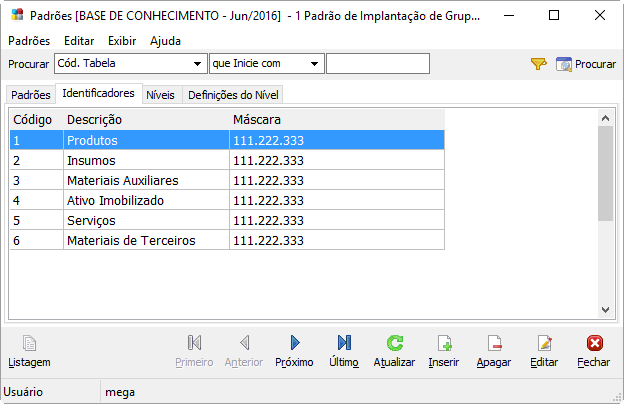 Em todas as tabelas estruturadas do sistema e nos cadastros onde é possível fazer a identificação dos registros, utilizando o conceito de árvore (treeview), é necessária a definição de uma máscara. Sem essa definição, não é possível cadastrar os registros. A estrutura dos diversos cadastros lançados em todos os módulos do ERP Mega, chamada de máscaras, são fundamentais para a consistência dos dados, pois elas irão permitir que o sistema não considere informações lançadas de uma forma diferente da definição que seria a correta.
