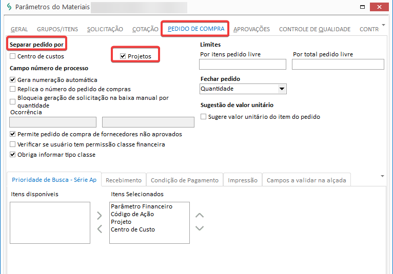 3. Na aba Pedido de Compra, no grupo 'Separar Pedido por' selecione a opção Projetos: