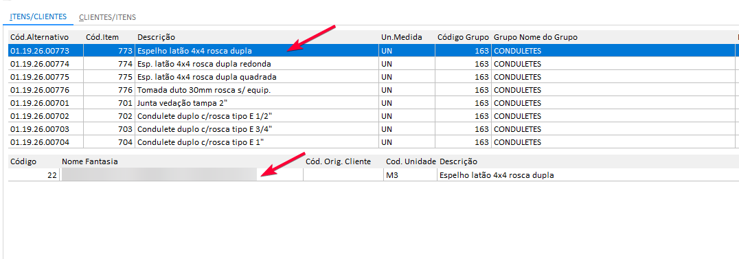 2. Na aba Itens/Clientes, na parte superior da tela, localize o item em questão: