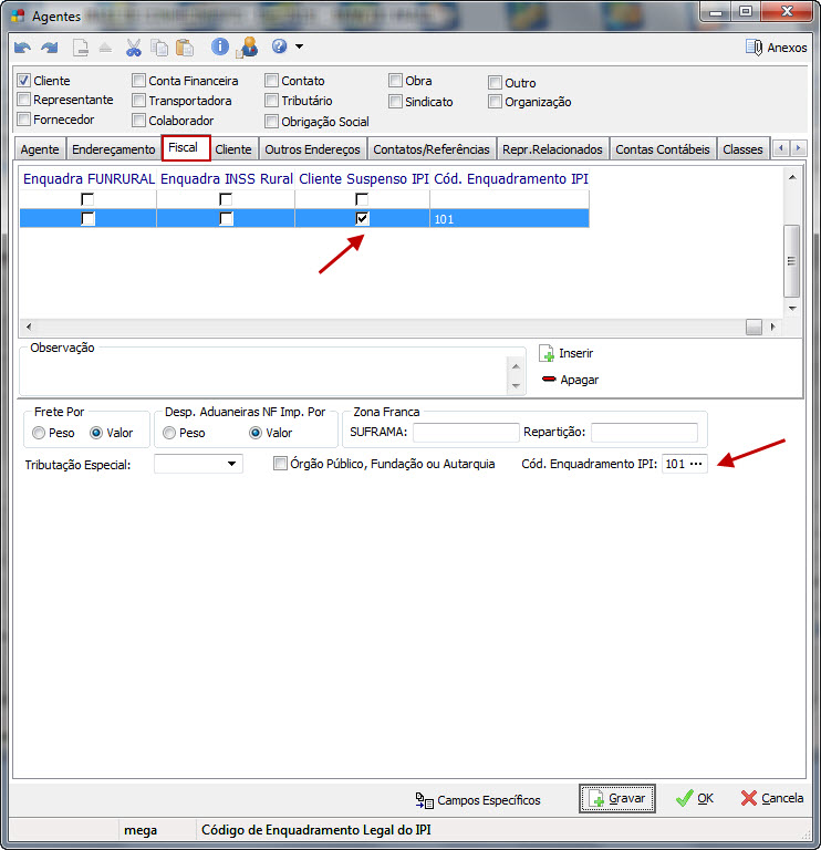 - Quando o agente estiver enquadrado como Cliente Suspenso de IPI, o Código de Enquadramento será buscado na aba Fiscal do próprio cadastro do agente. Para verificar se está configurado realize os seguintes passos: