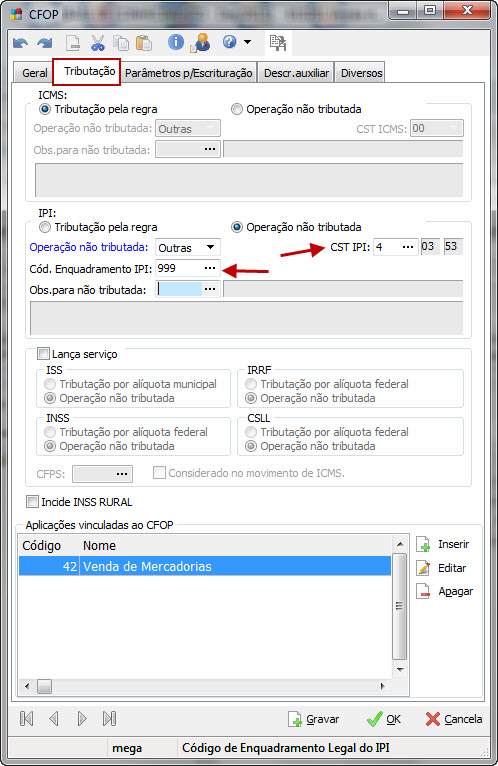 - Quando a operação de IPI não for tributada, o Código de Enquadramento será buscado do CFOP utilizado na operação. Para verificar se está configurado realize os seguintes passos: