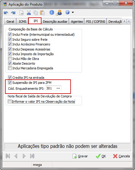 - Na aba IPI, verifique se a opção 'Suspensão de IPI para ZFM' está marcada e se o Cód. Enquadramento IPI está preenchido: