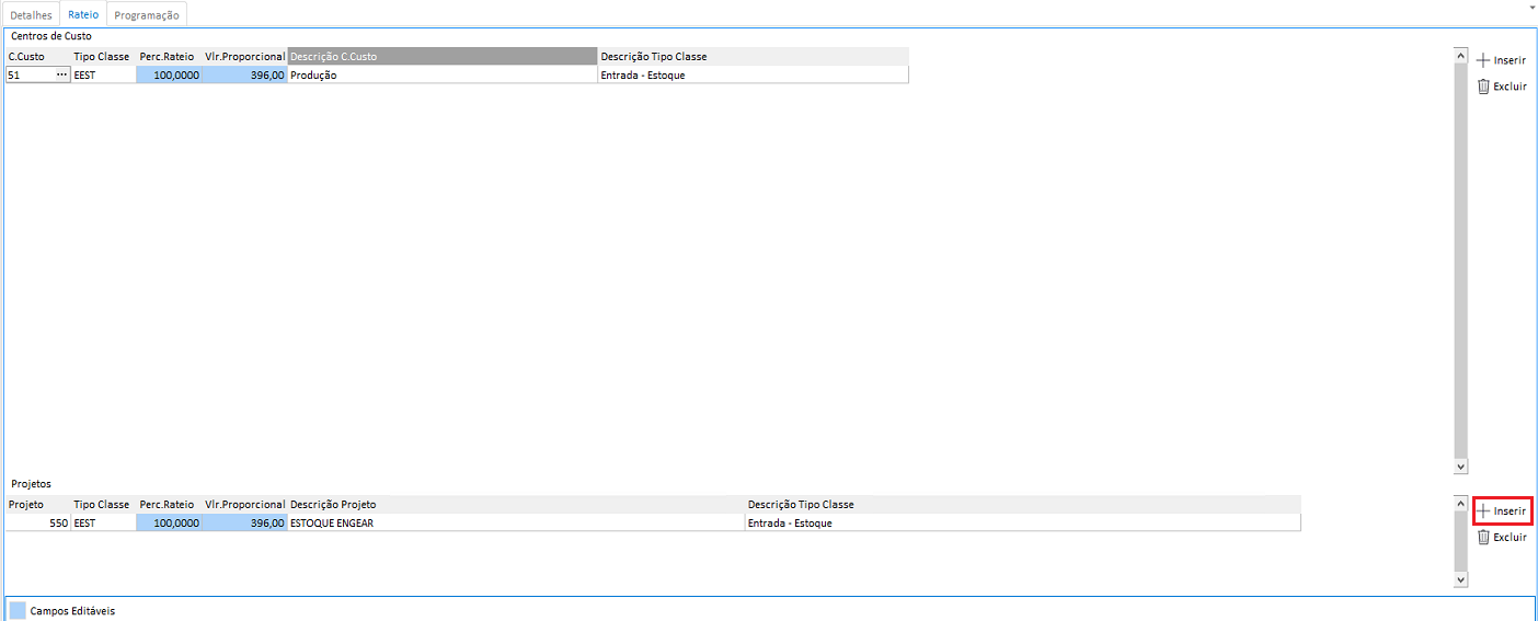 Observação: Caso exista a necessidade de efetuar o rateio para um Projeto diferente para o mesmo Centro de Custo, basta inserir mais projetos para o mesmo centro de custo.