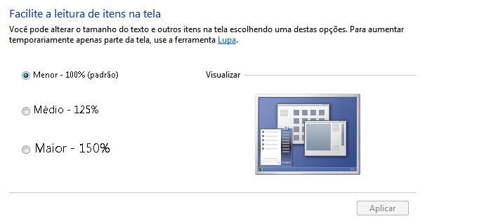 - Clique em Ampliar ou reduzir texto e outros itens e configure para o tamanho padrão e recomendável do windows (100%) e clique em Aplicar para salvar as configurações: