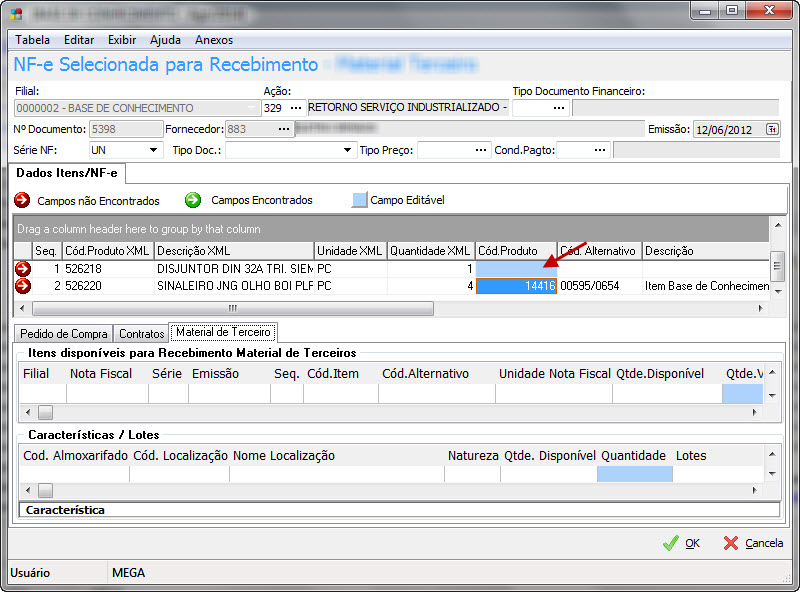 ERP MEGA - Recebimento via XML - Gravação não permitida. Os campos correspondentes para o item XX do XML não foram vinculados