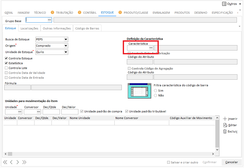 ERP MEGA - Grupos e Itens - Como informar característica para um item