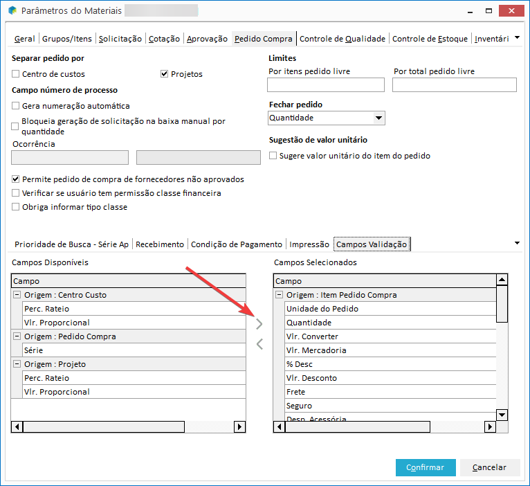 2. Na aba Pedido de Compra, sub aba Campos Validação, selecione os campos desejados na grid Campos Disponíveis e clique para movê-los para a grid Campos Selecionados: