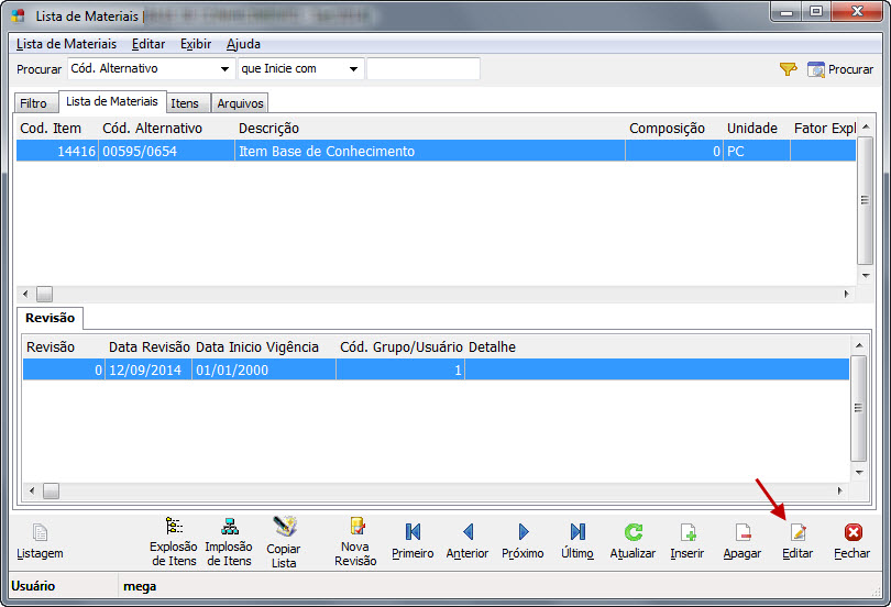4. Na aba Itens Lista Material, selecione o item em questão e clique em Editar;