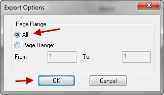 6. Na tela Export Options, selecione a opção ALL para exportar todas as folhas do relatório ou PAGE RANGE e digite no campo From o intervalo de páginas para exportação, clique em ok: