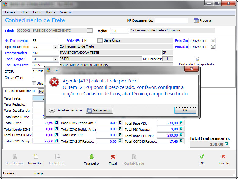 ERP MEGA - Agente XX calcula Frete por Peso. O item XX possui peso zerado