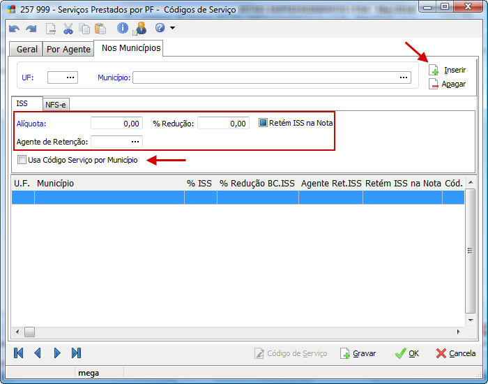 5. Na aba Nos Municípios, sub-aba ISS, clique em Inserir;