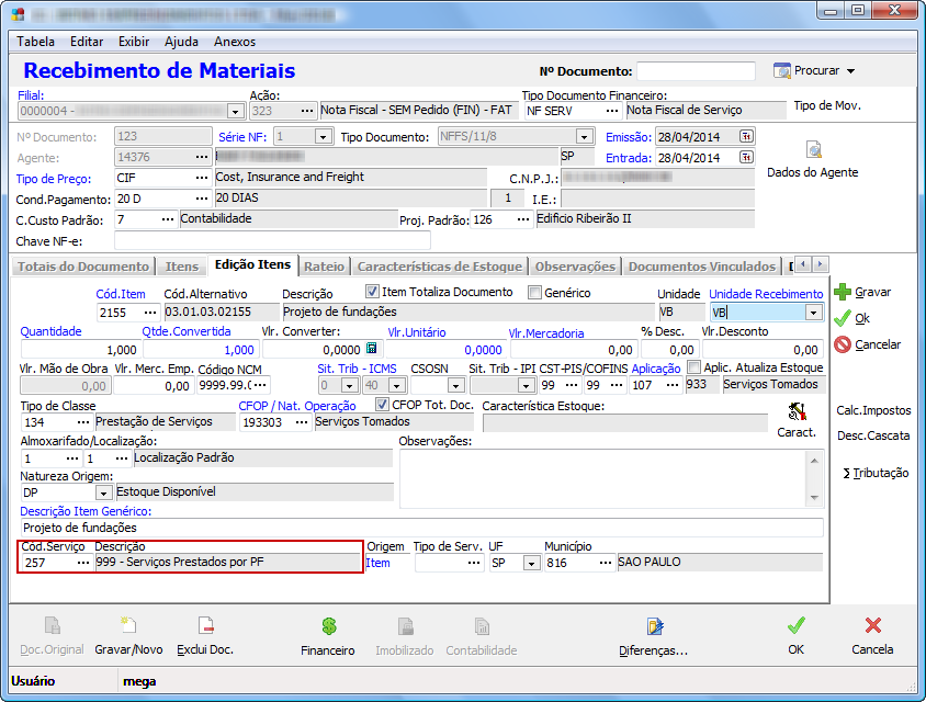 2. Localize o lançamento em questão e na aba Edição de Itens, verifique o código de prestação de Serviço no campo Cod.Serviço: