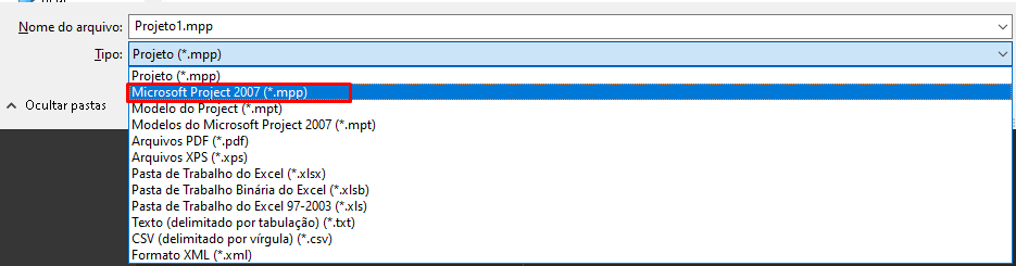 Para que a mensagem não seja apresentada ao tentar importar um arquivo do Ms Project para o Mega, é necessário salvar o arquivo .MPP com a seguinte versão de extensão: Microsoft Poject 2007(*.mpp):