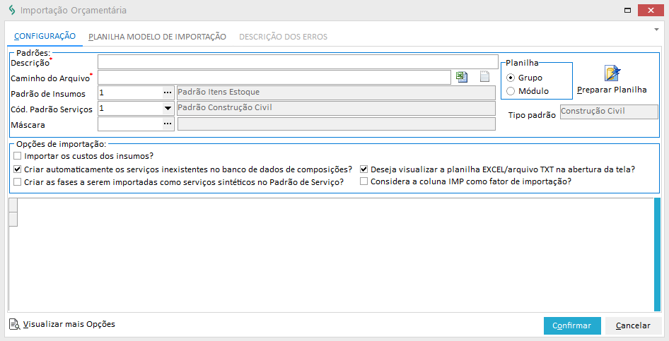 Planilha Grupo ou Módulo: Defina se a importação do orçamento se dará para Grupo ou Módulo.