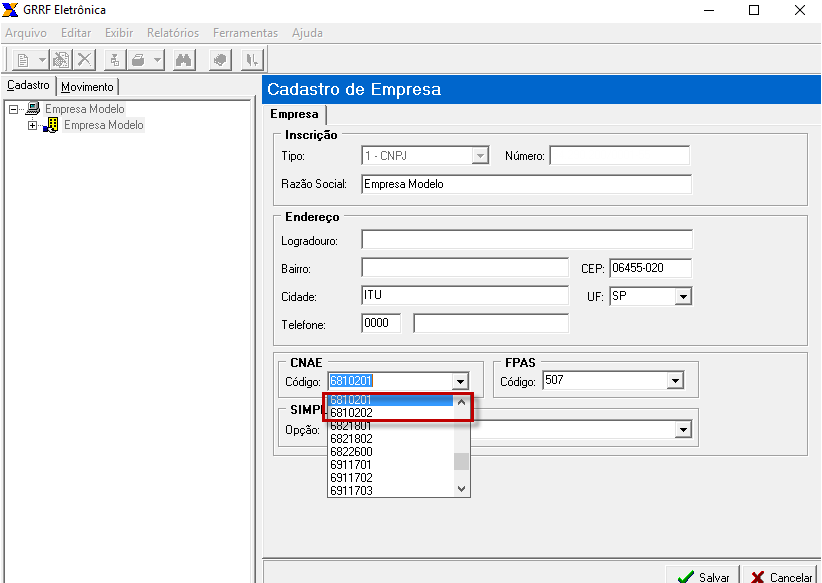 ERP MEGA - GRRF - Inconsistência: 140 - CNAE inválido