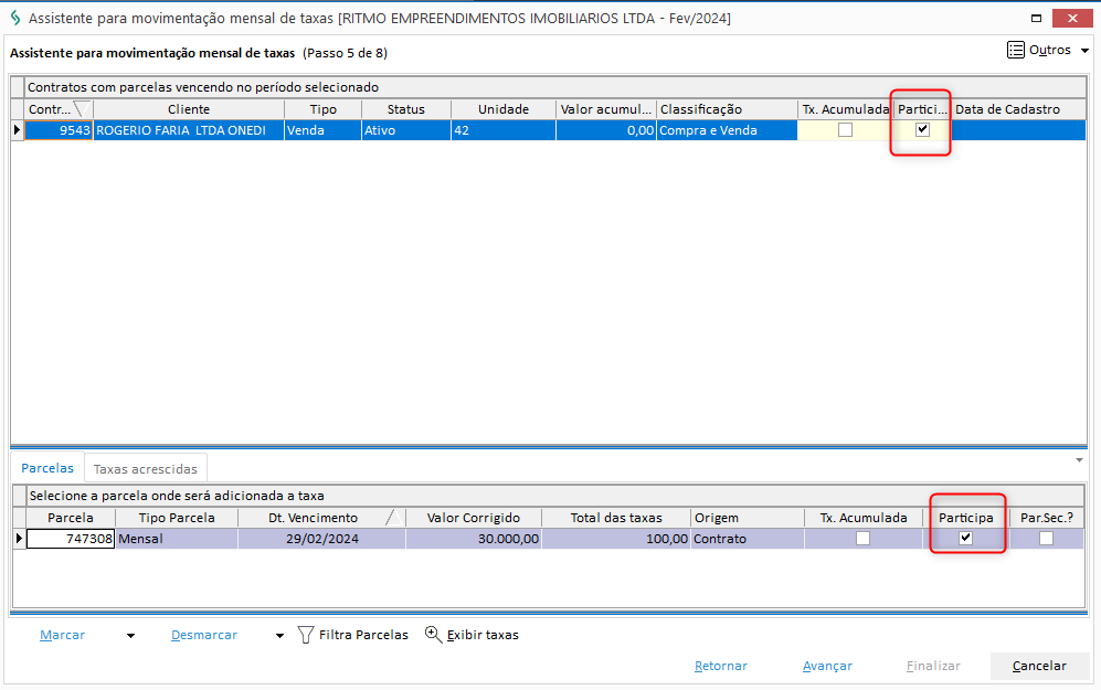 6. Selecione os contratos e parcelas, e clique em avançar: