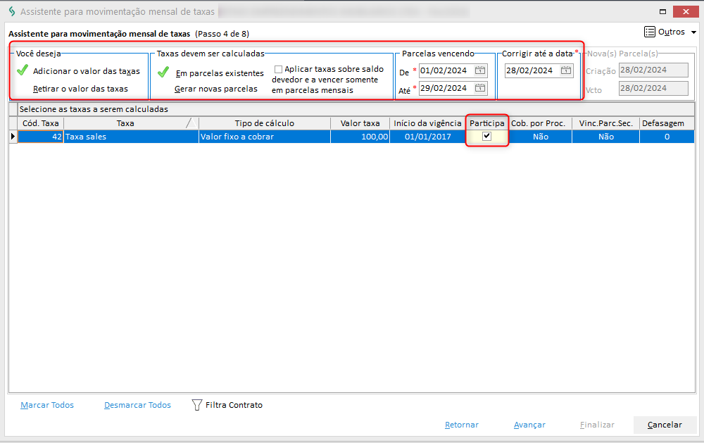 5. Informe o período de vencimento das parcelas, selecione as taxas desejadas, e clique em avançar;