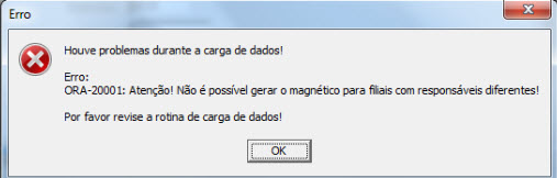 Nos Arquivos Magnéticos, ao tentar gerar o SEFIP, é apresentado a mensagem: Houve problemas durante a carga de dados! Erro: Ora-20001: Atenção! Não é possível gerar o magnético para filiais com responsáveis diferentes! Por favor revise a rotina de carga de dados!
