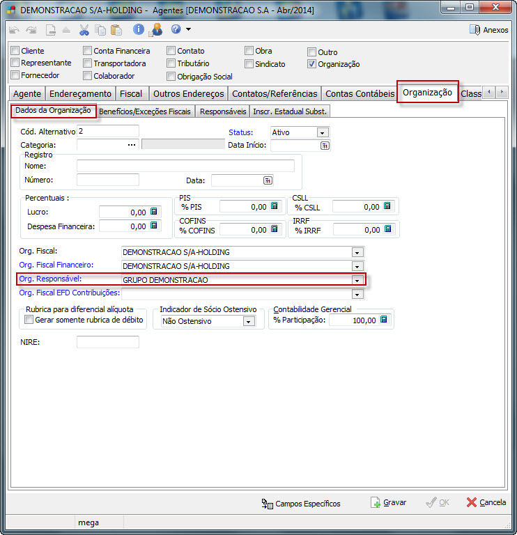 3. Na aba Organização, clique na sub pasta Dados da Organização, vincule a Consolidadora que será responsável pela emissão do arquivo na opção Org.Responsável: