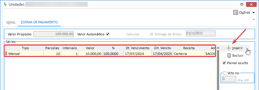 3. Clique em Inserir no quadro Séries, defina as séries de parcelas desta proposta: