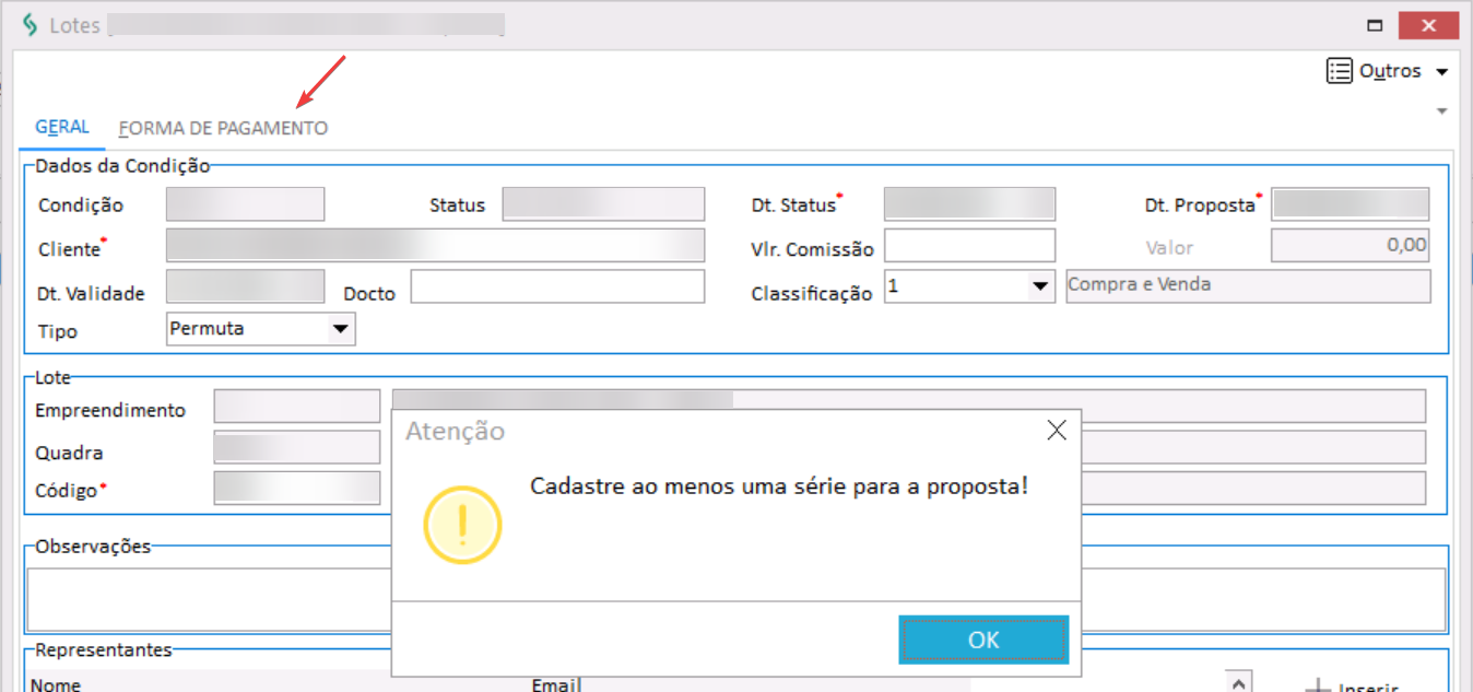 Observação: As parcelas deverão ter vencimento igual ou maior à data da proposta que fica na aba Geral no campo Dt. Proposta.