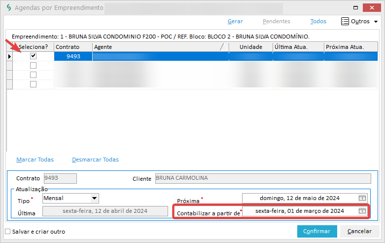 3. Selecione o contrato desejado e no campo Contabilizar a partir de, preencha a data base retroativa: