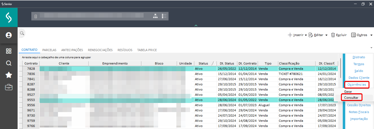 2. Selecione o contrato desejado e clique na barra lateral azul em Ocorrências / Consultar: