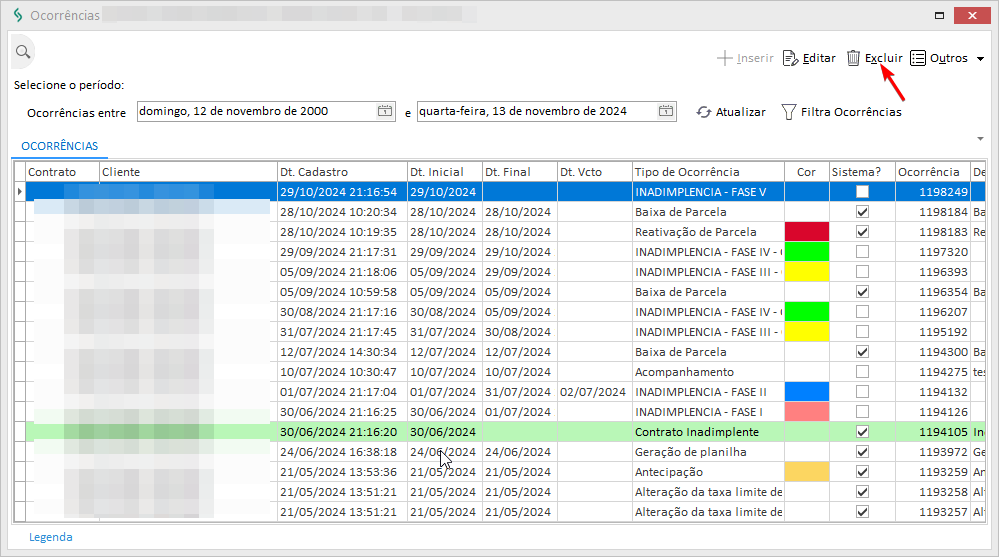 5. Selecione a ocorrência desejada e clique em Excluir: